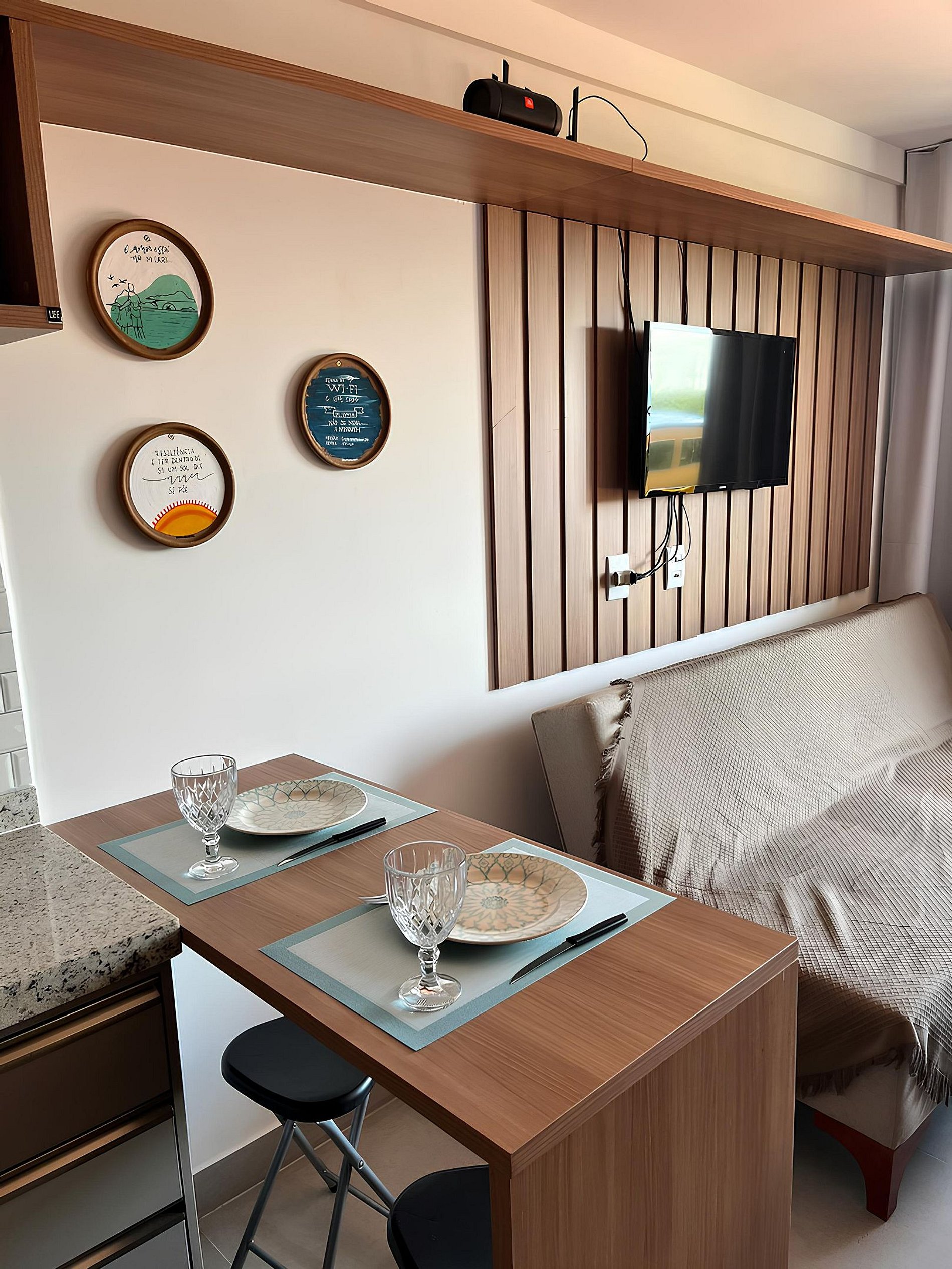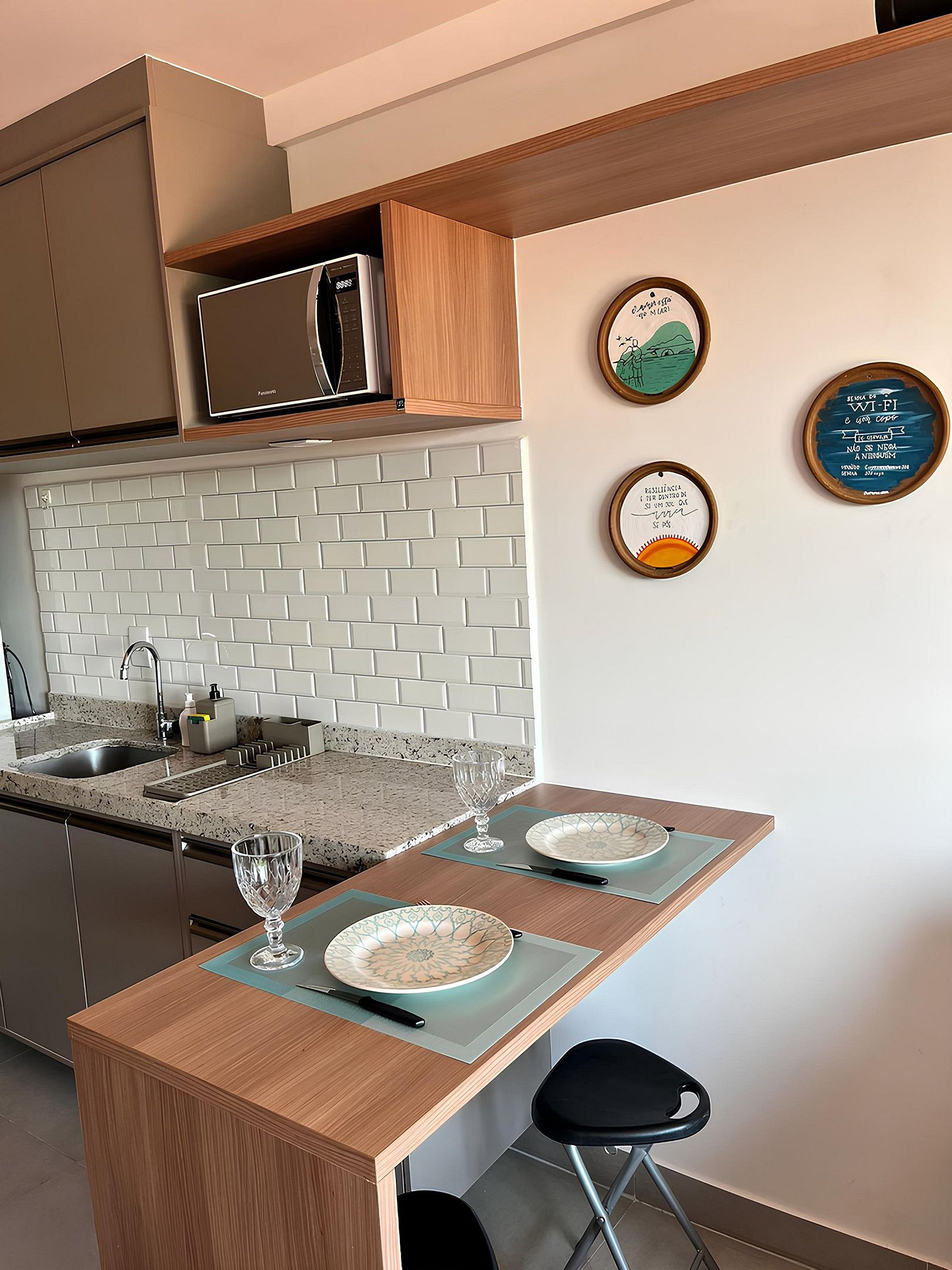 Decoração Elegante: Cada flat é decorado com móveis de design, criando um ambiente acolhedor e estiloso.
