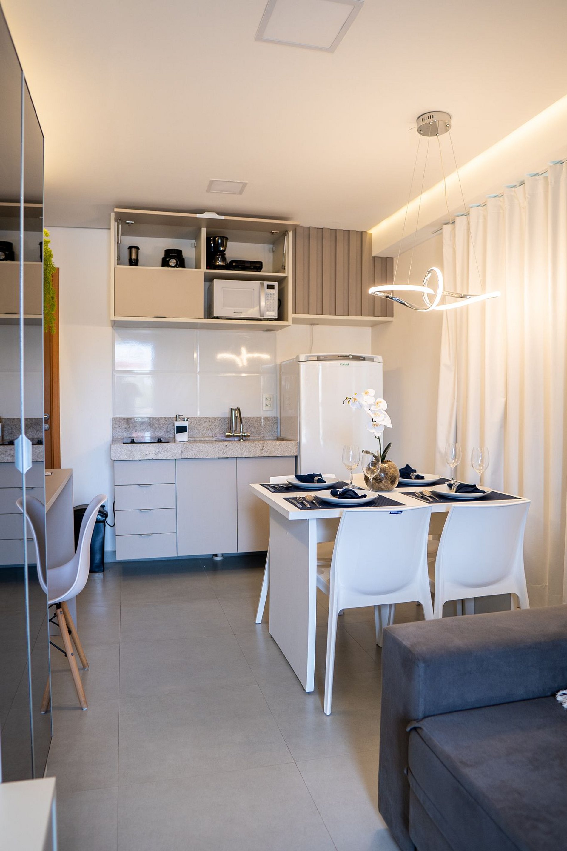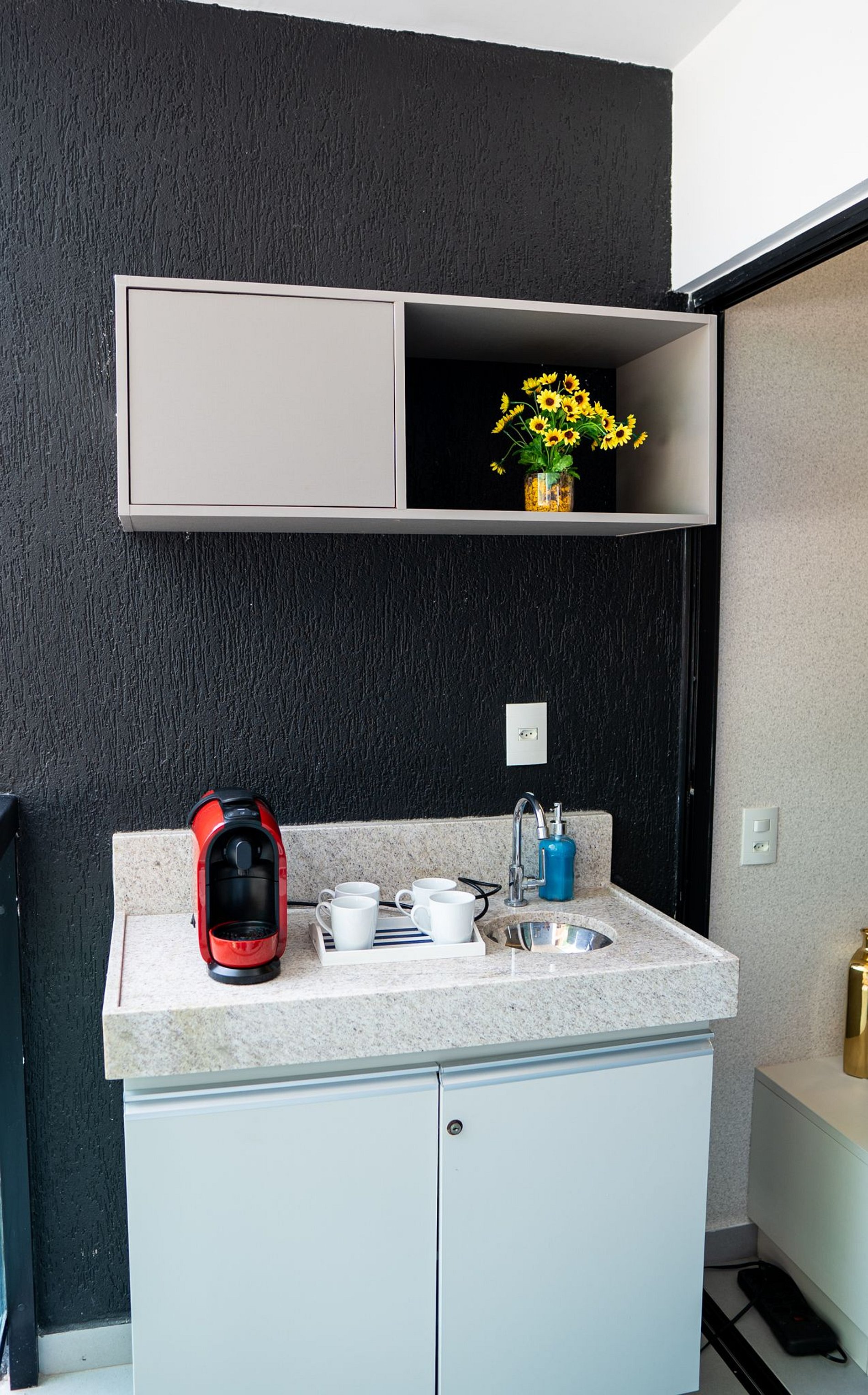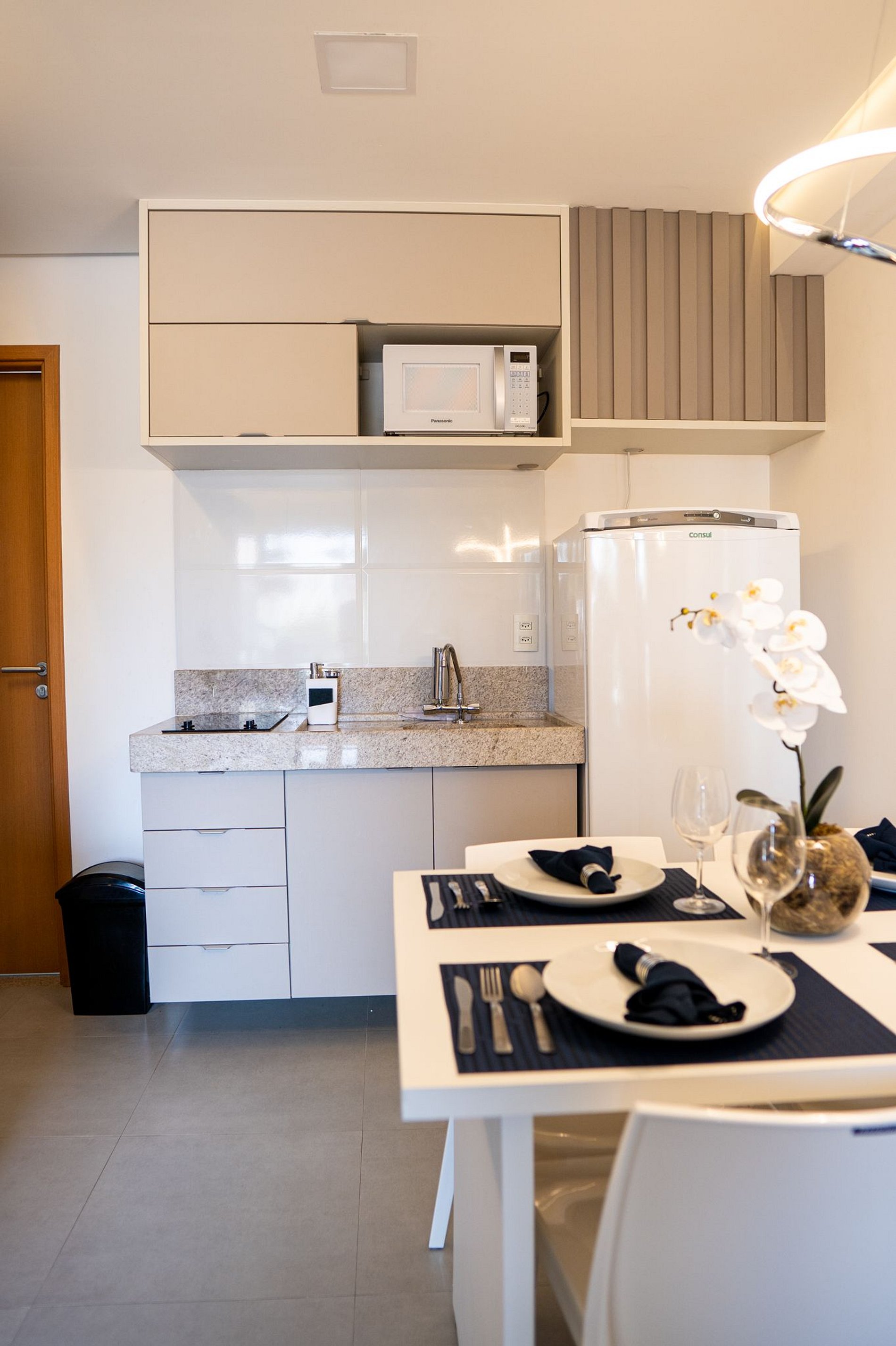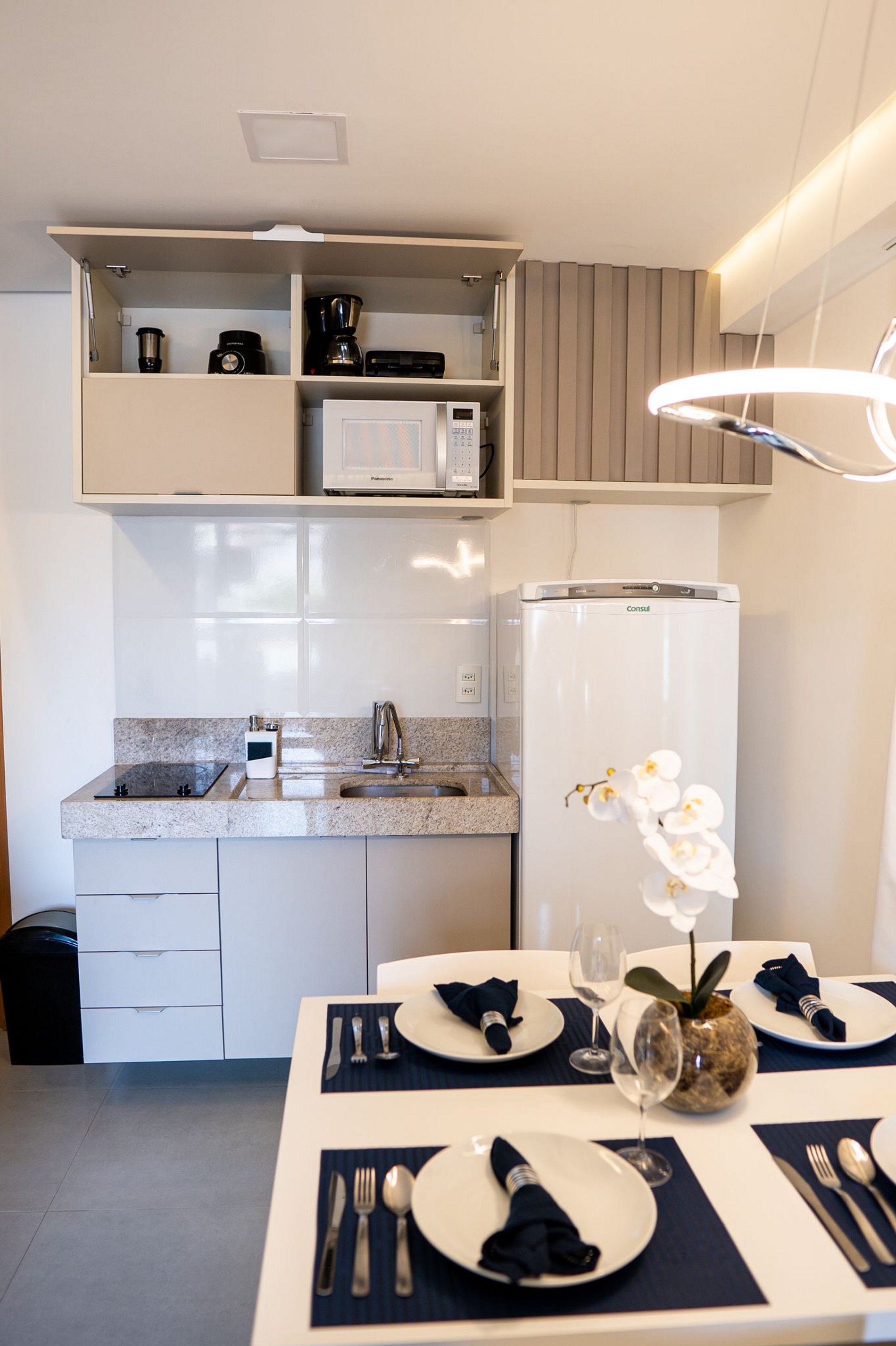 Equipada com cooktop, geladeira, micro-ondas, cafeteira, panelas e utensílios básicos para pequenas refeições.