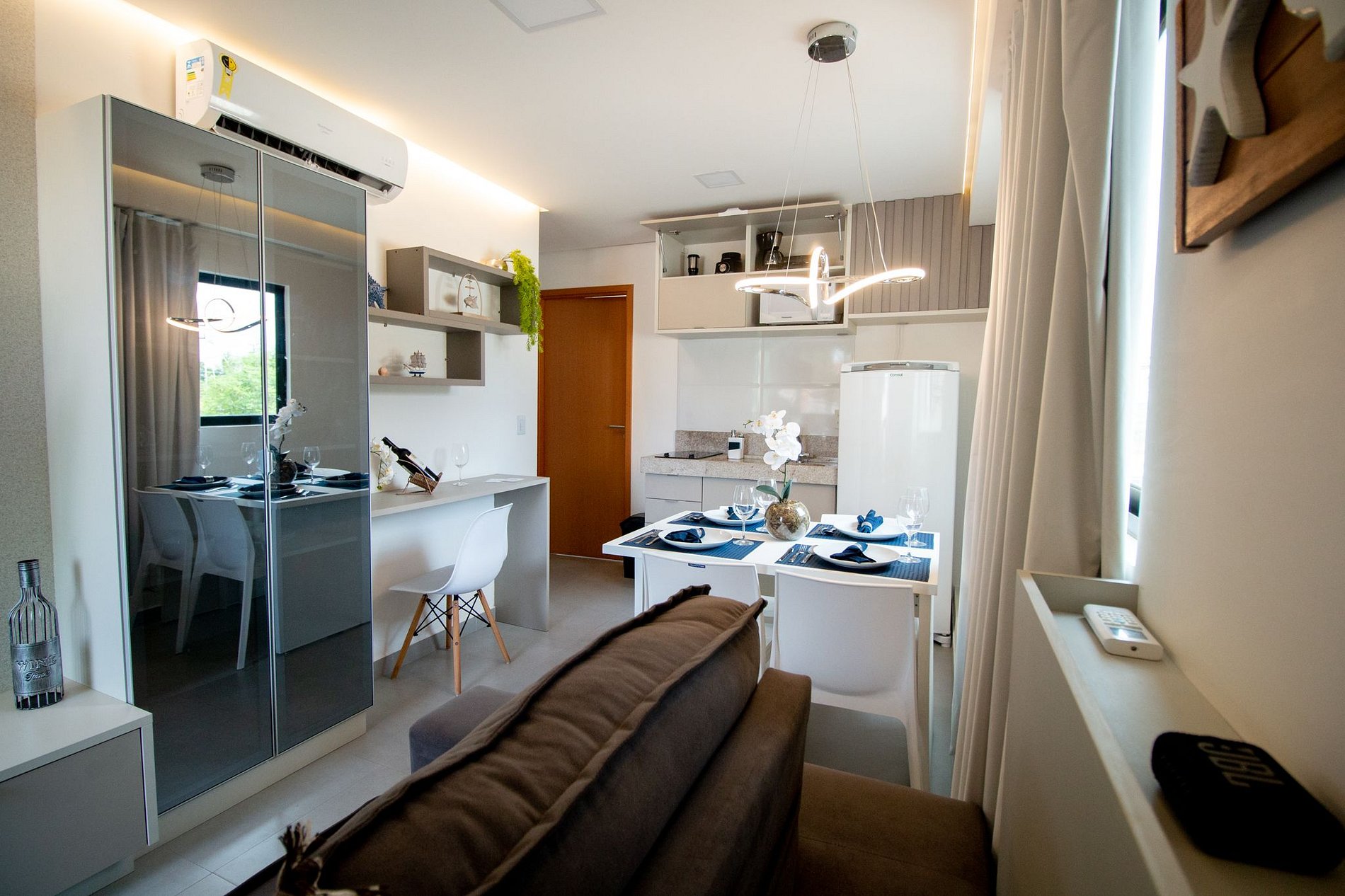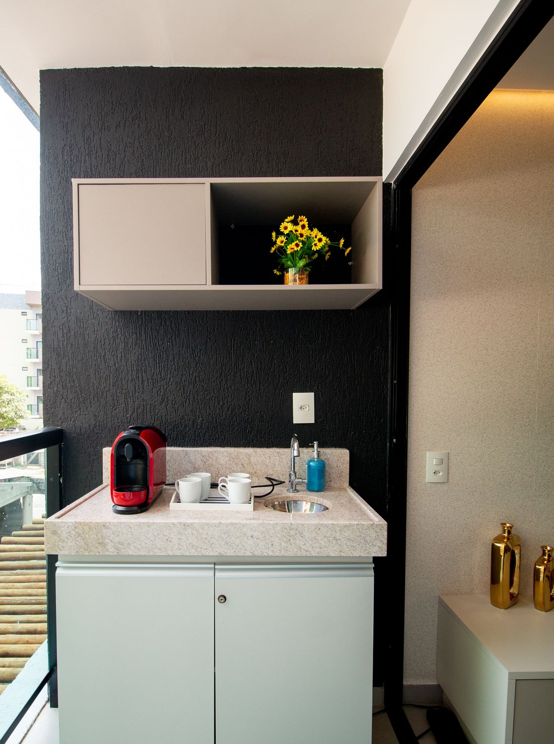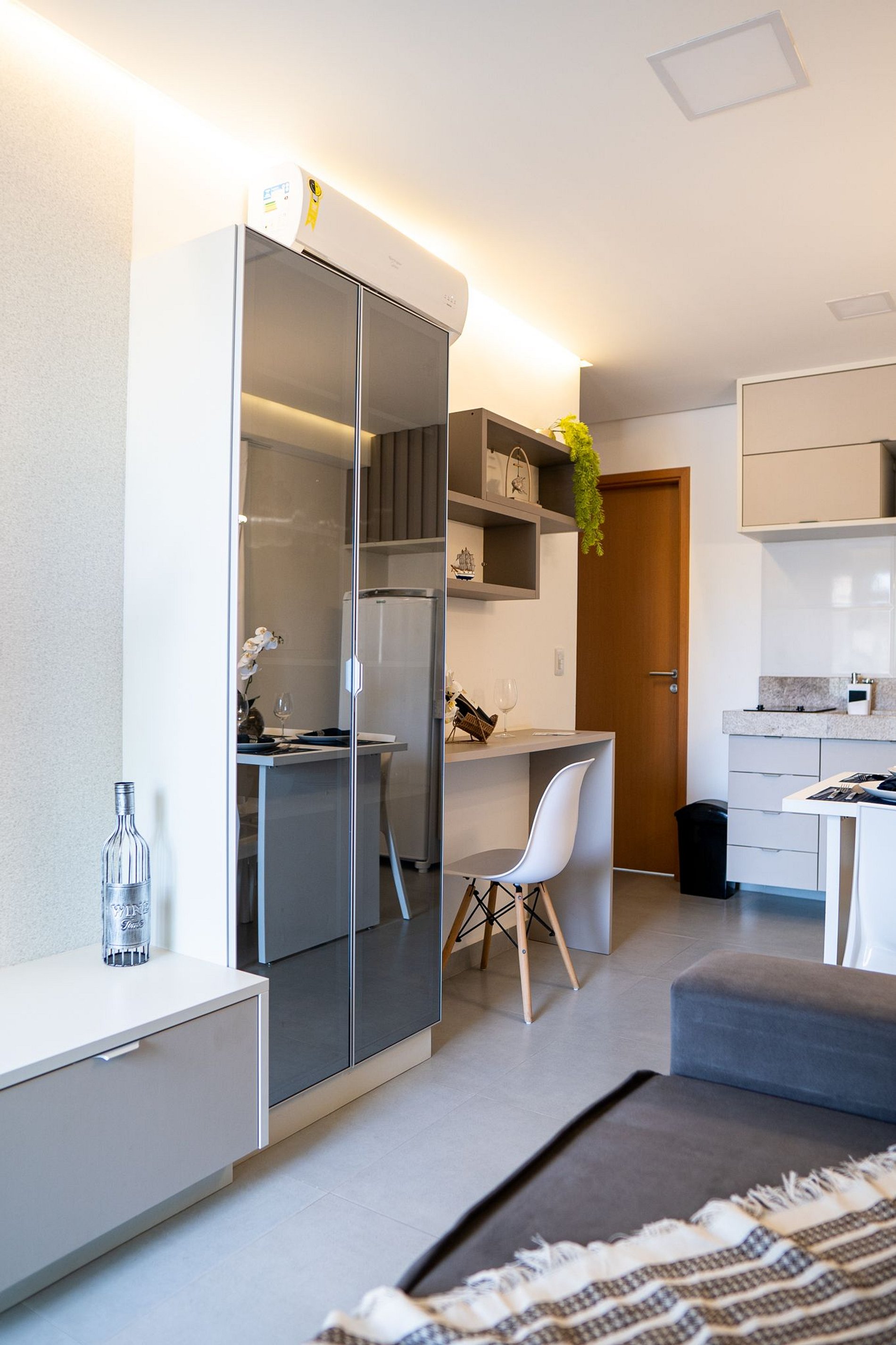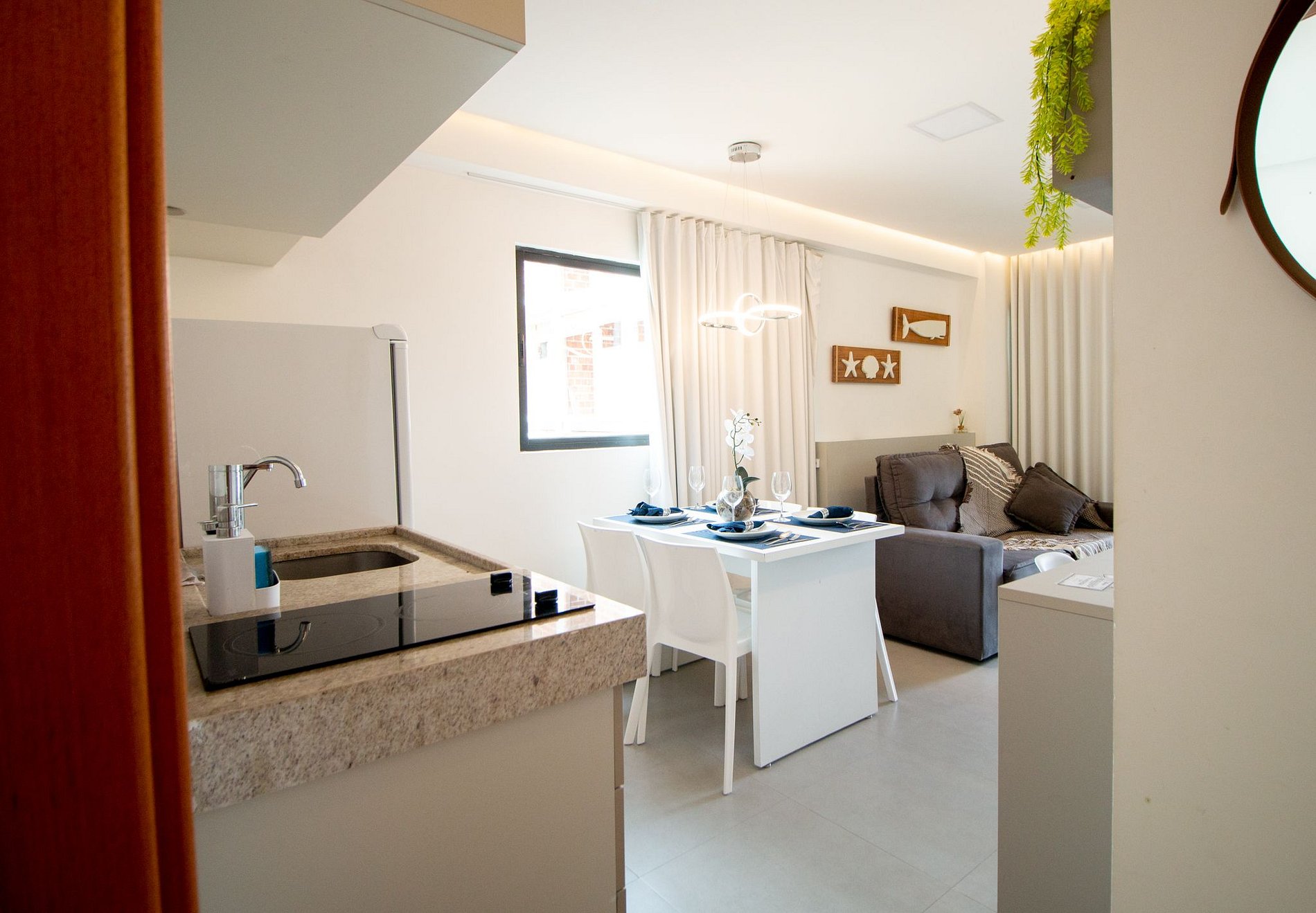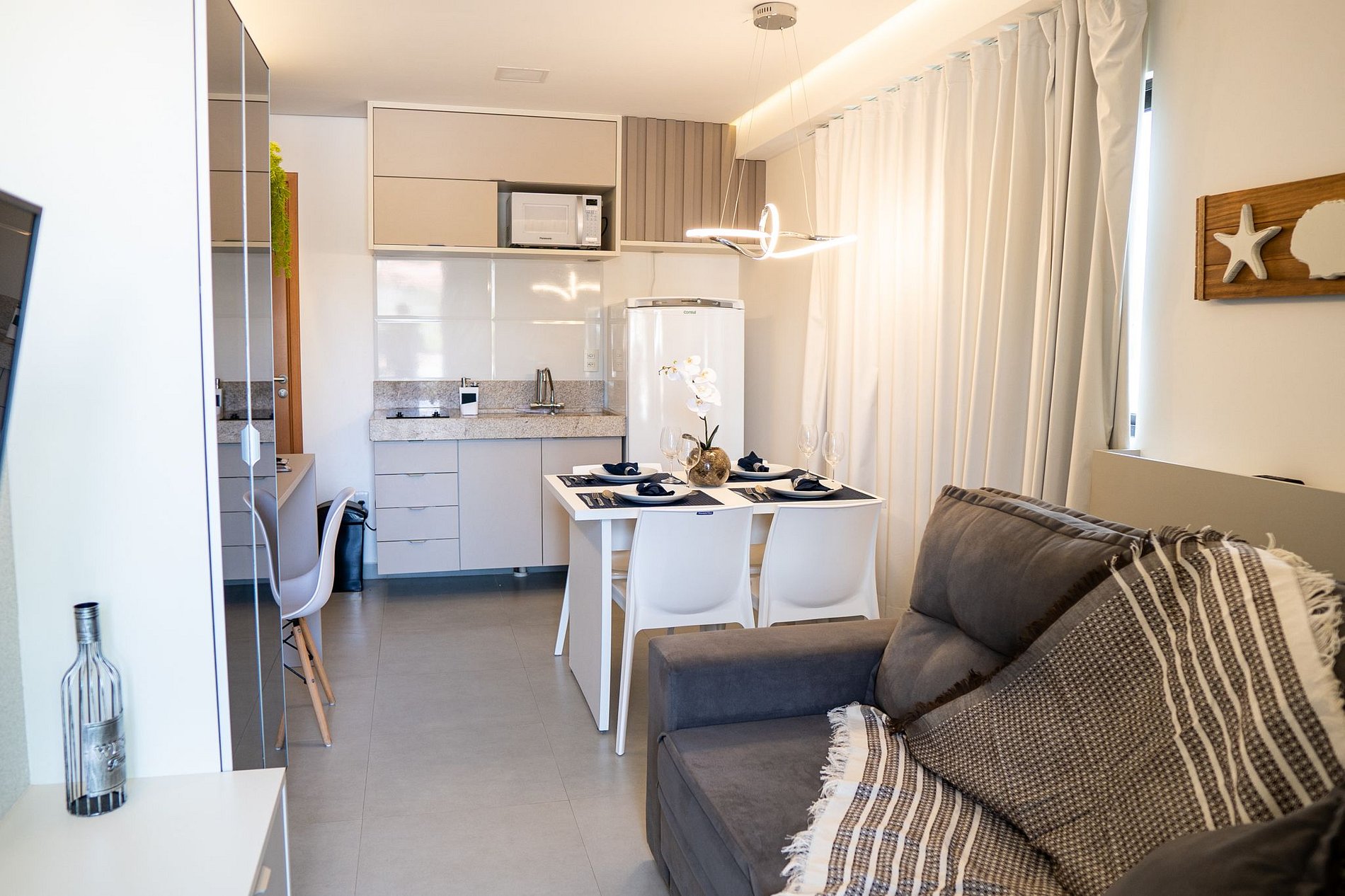 Equipada com cooktop, geladeira, micro-ondas, cafeteira, panelas e utensílios básicos para pequenas refeições.